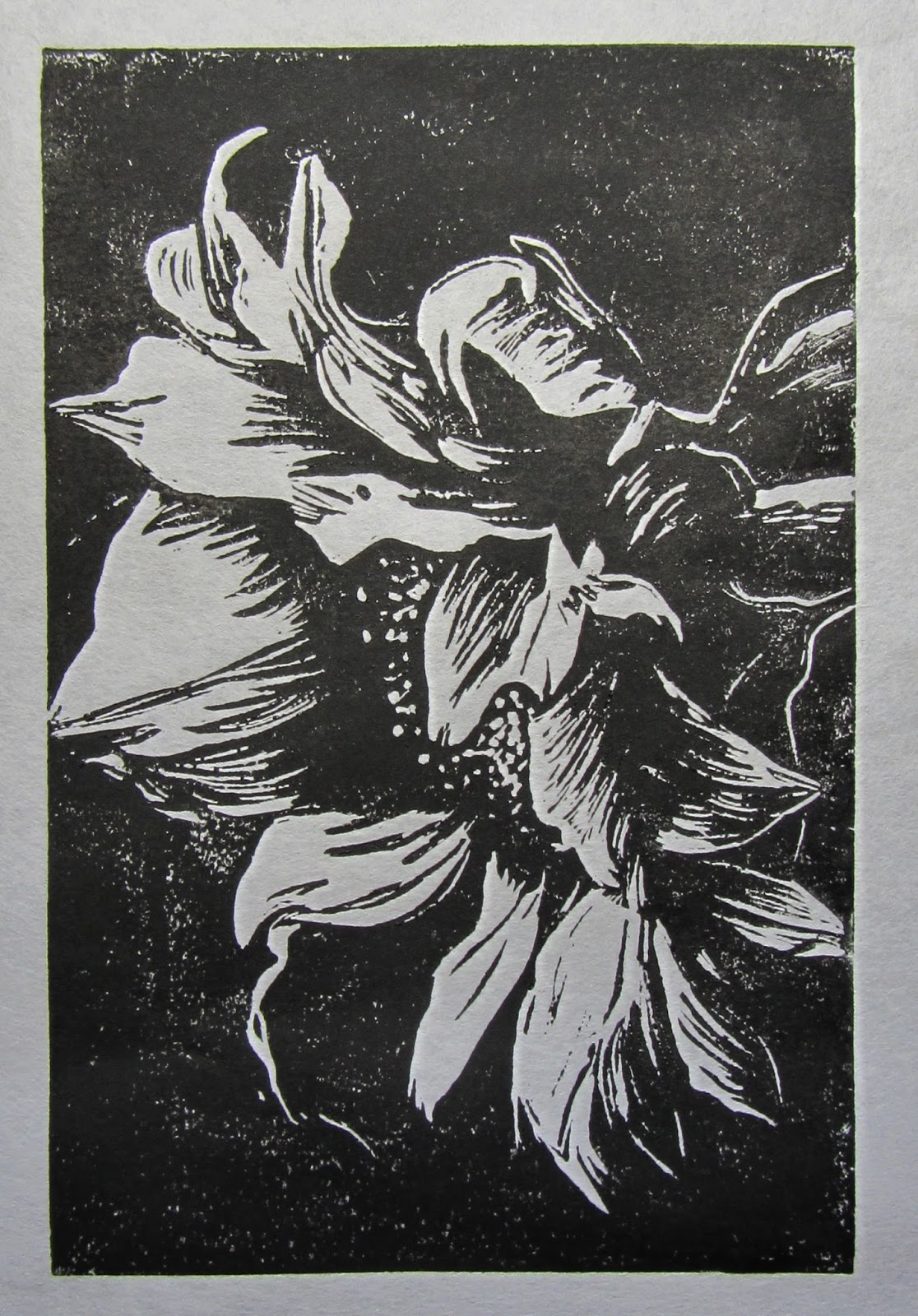 My goal for this was to create a print that only picked up the highlights of a flower to define it's shape.  After a few tries of carving, doing a trial print, carving some more, another trial print, etc. I finally got it where I wanted it, the final size is 4" x 6".  (And, yes, I forgot to reverse it on the lino so it would print the same direction...lesson learned.)
